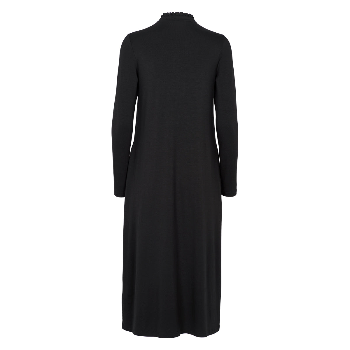 Das Kleid ist lang geschnitten, hat lange Ärmel und eine halbhohe Halslinie mit zarten Rüschen. Auch entlang der Knopfleiste auf der Vorderseite setzen feine Rüschen stilvolle Akzente – feminin, ohne verspielt zu wirken.