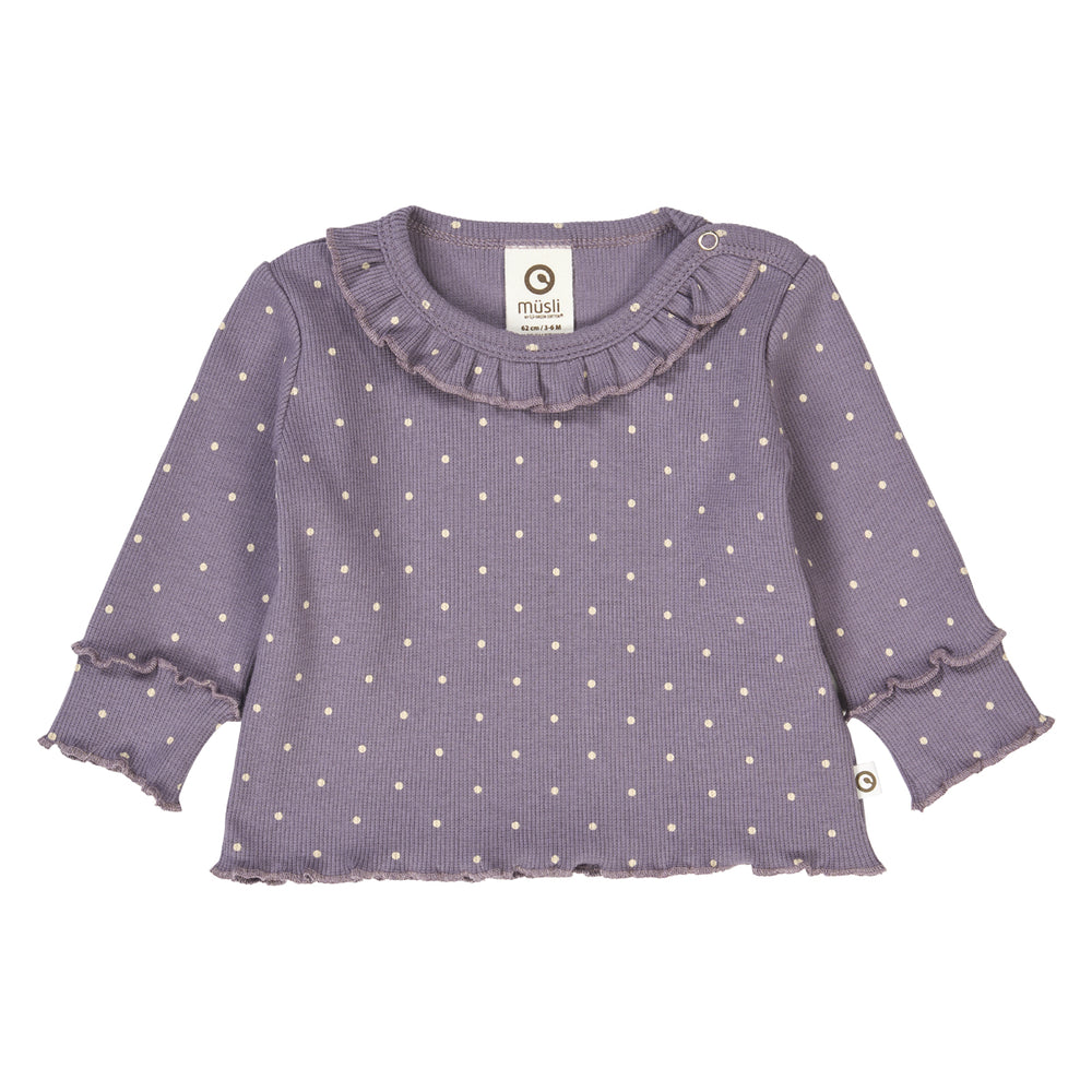 Der angenehme 2x2 Rib Stoff aus 95% Baumwolle, 5% Elasthan ist besonders angenehm zu tragem. Der lilafarbene Hintergrund mit vielen kleinen Punkten passt perfekt zur verspielten Passform des Shirts.