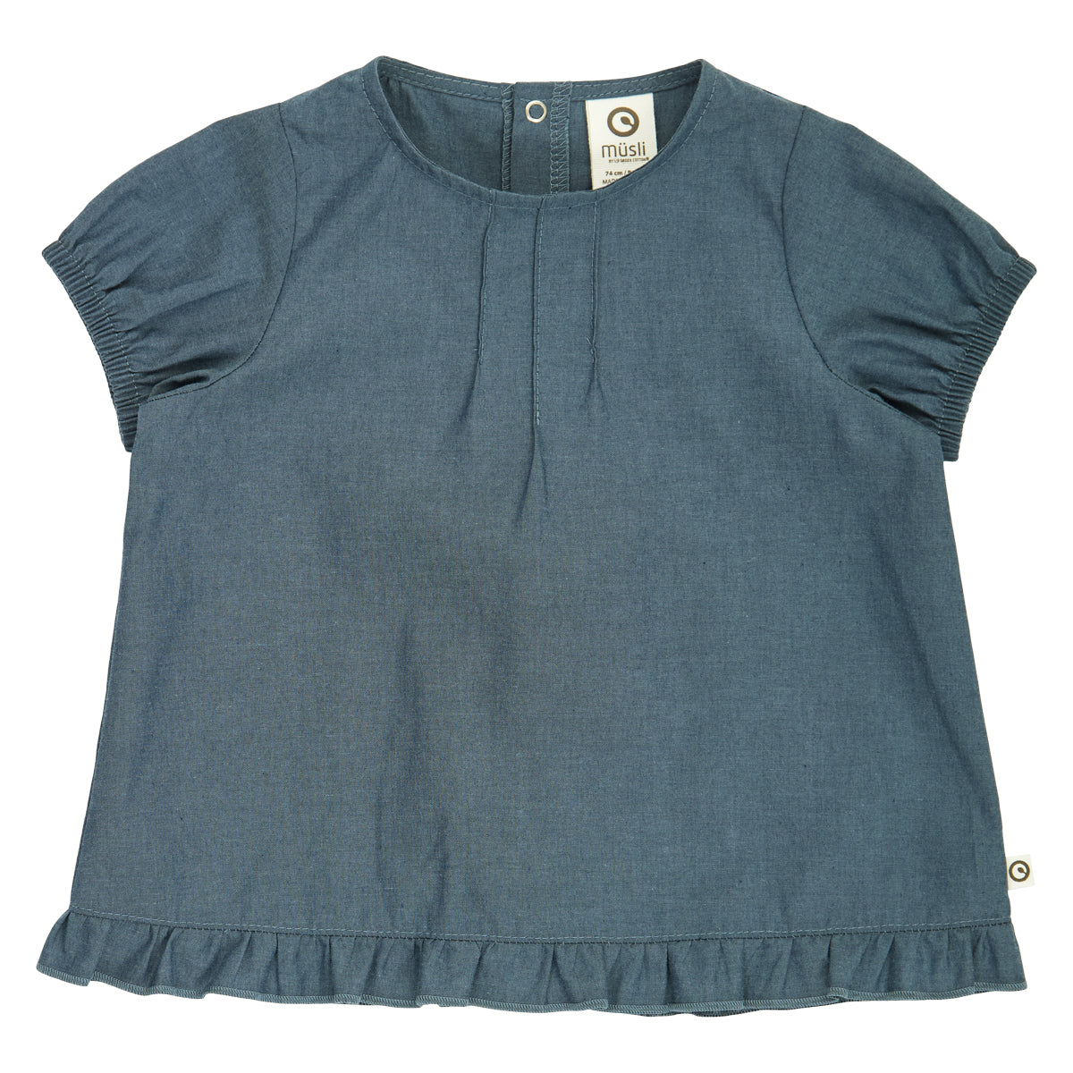 Dieses niedliche Top aus leichter, gewebter Chambray-Baumwolle ist der perfekte Begleiter für warme Sommertage. Die kurzen Puffärmel und die verspielten Rüschen am Saum verleihen dem Oberteil einen charmanten, mädchenhaften Look.