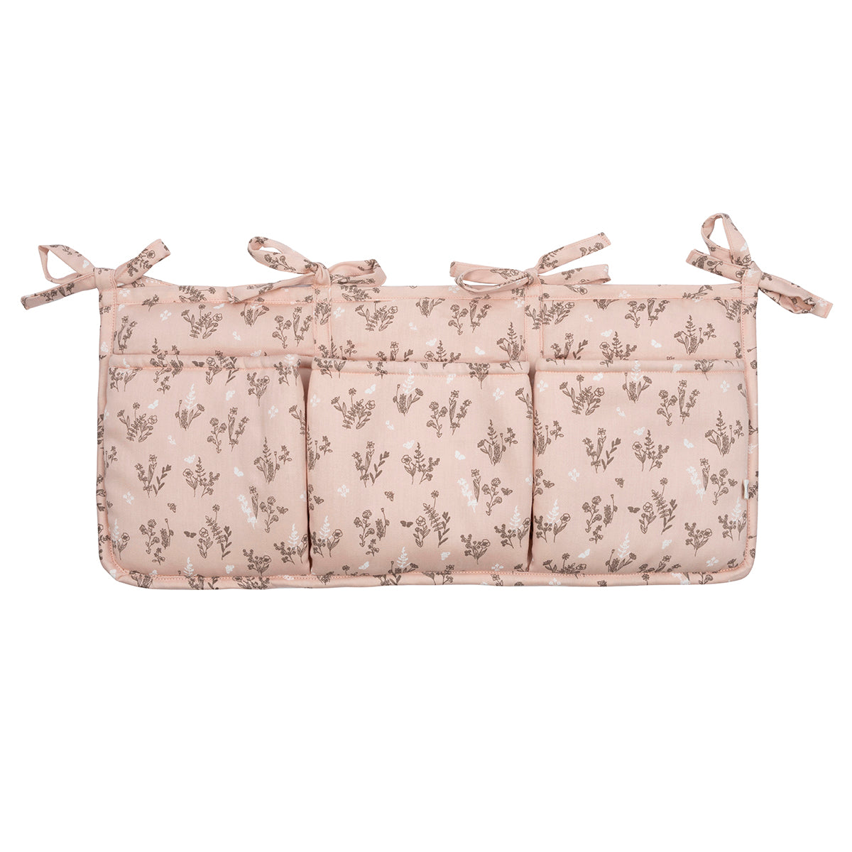 Der weiche Bettorganizer kann mit Schlaufen am Gitterbett befestigt werden. Er ist mit drei Taschen versehen und eignet sich perfekt zum Ordnen von Pixiebüchern, Schnullern und vielem mehr. Er ist 50 cm lang uns 20 cm hoch. Das Außenmaterial besteht aus einem Webstoff aus 100% biologischer Baumwolle.