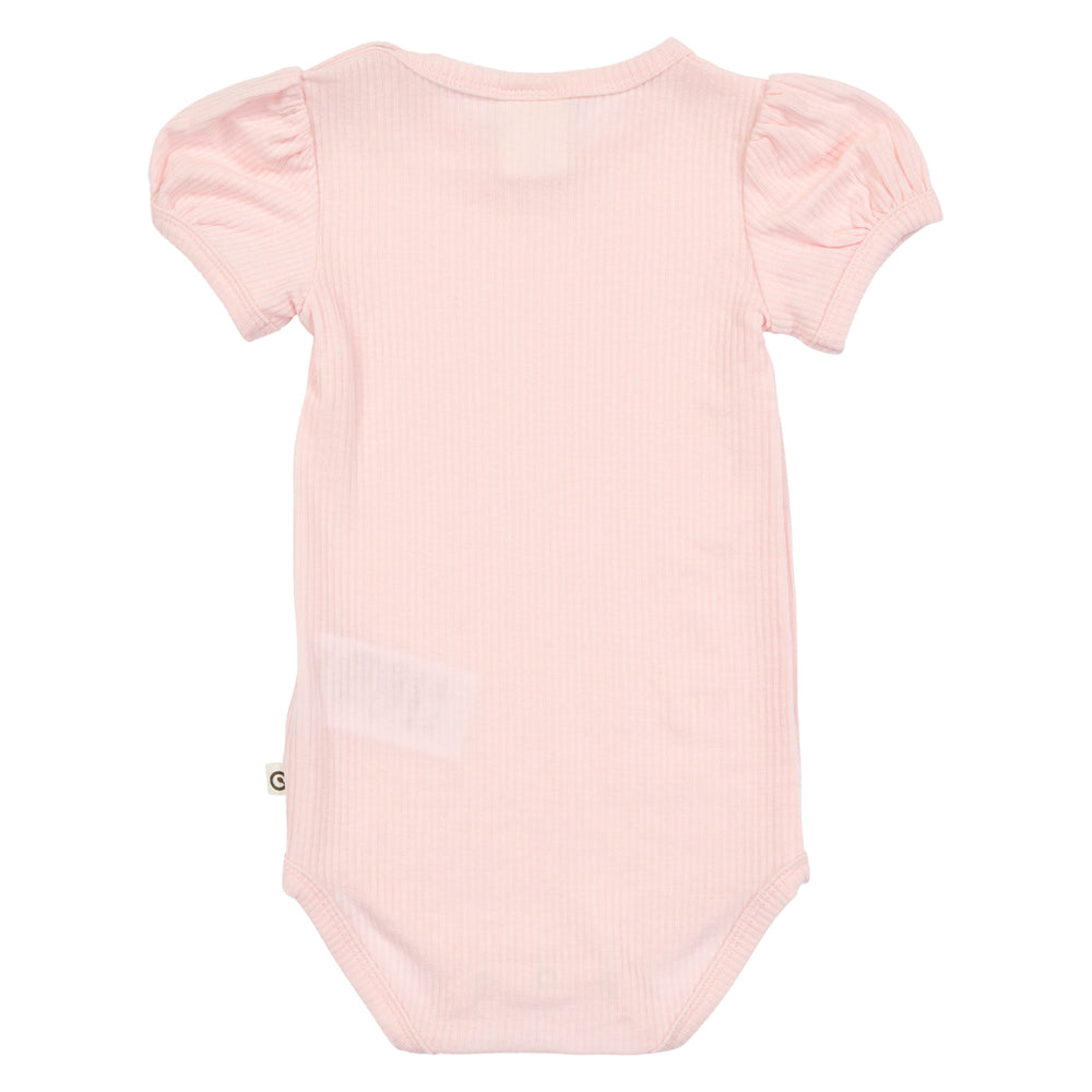 Der Kurzarmbody besteht aus einer weichen, einfarbigen Tencel-Qualität. Der Stoff ist fein gerippt und besonders weich, was für ein angenehmes Tragegefühl sorgt. Der Body hat kurze Puffärmel und lässt sich am Halsausschnitt sowie am unteren Ende mit Druckknöpfen öffnen. Diese Funktionen erleichtern das An- und Ausziehen sowie das Windelwechseln.