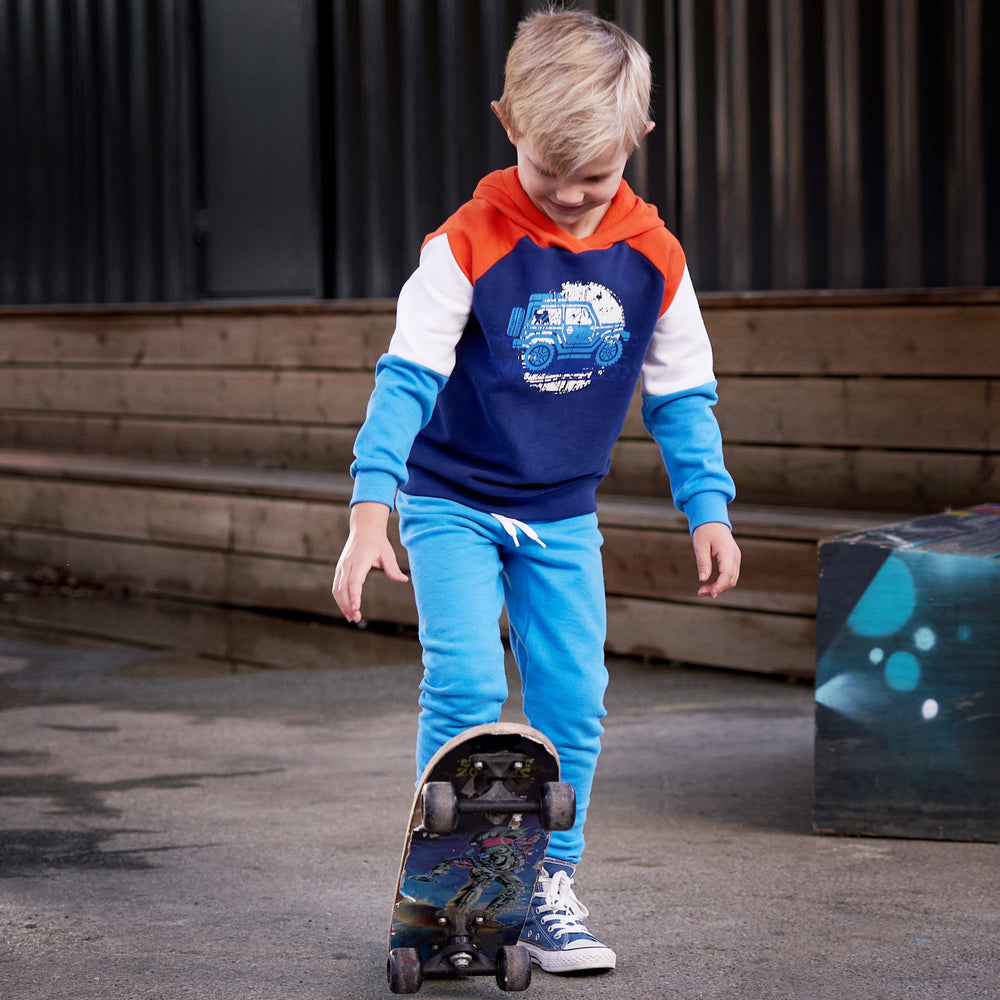 Der weiche Hoodie ist aus reiner Bio-Baumwolle hergestellt. Er verfügt über einen Auto-Druck auf der Frontseite und ist innen warm angeraut. Der Pullover hat eine praktische Kapuze, die farblich abgesetzt ist und ist besonders weich und bequem.