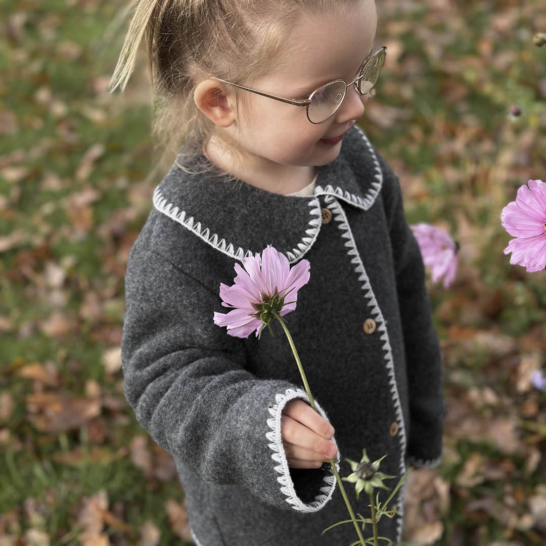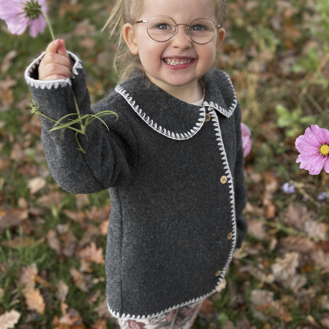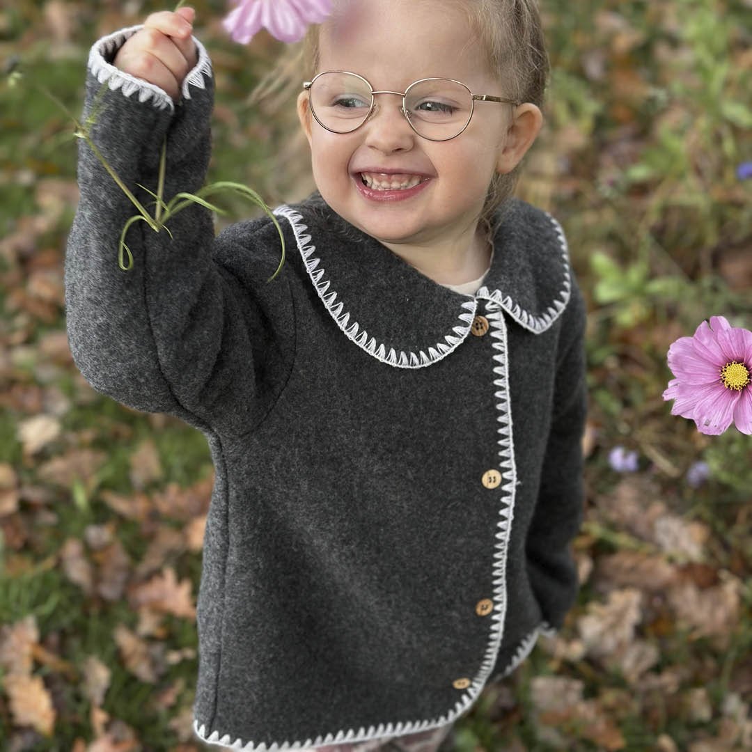 Ein liebevolles Detail ist die dekorative Zierstichkante entlang der Ränder, die der Jacke einen stilvollen, handgemachten Look verleiht. Die praktische Knopfleiste auf der Vorderseite macht das An- und Ausziehen kinderleicht – auch für die Kleinsten. Dank ihres zeitlosen Designs lässt sich die Jacke vielseitig kombinieren und wird schnell zum unverzichtbaren Begleiter in der Übergangszeit oder an kühleren Tagen.
