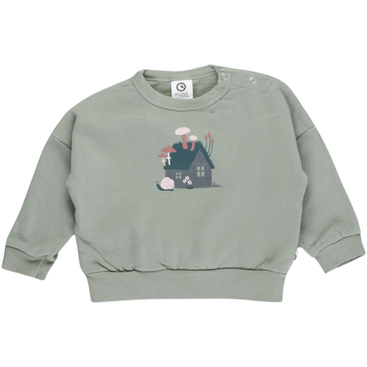 Unser Shirt präsentiert sich in einem warmen Moosgrün und zeigt auf der Brust ein detailreiches Motiv einer Waldhütte. Aus dem dunklen Dach des Hauses wachsen verschiedene Pilze heraus, während eine Schnecke gemächlich vorbeikriecht. Diese charmanten Details verleihen dem Shirt einen besonderen und verspielten Touch.