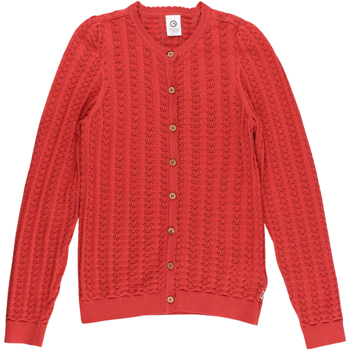Unsere Kinder-Strickjacke in leuchtendem Rot begeistert mit einem super niedlichen und wunderschönen Design. Das schöne Lochmuster verleiht der Strickjacke eine besondere Note und macht sie zu einem echten Blickfang. Die Strickjacke wird vorne mit hübschen Knöpfen geschlossen, die aus Kokosnüssen hergestellt sind. Der 100% Baumwollstrick mit Muster sorgt für ein angenehmes Tragegefühl und eine hervorragende Atmungsaktivität. Mit dieser roten Strickjacke sind die kleinen Lieblinge nicht nur wunderbar warm angezogen, sondern auch absolut stilvoll gekleidet. Die Kombination aus dem süßen Lochmuster und den exotischen Kokosnussknöpfen verleiht dieser Strickjacke eine einzigartige und besondere Ausstrahlung.Neuer Preis 59.9 €