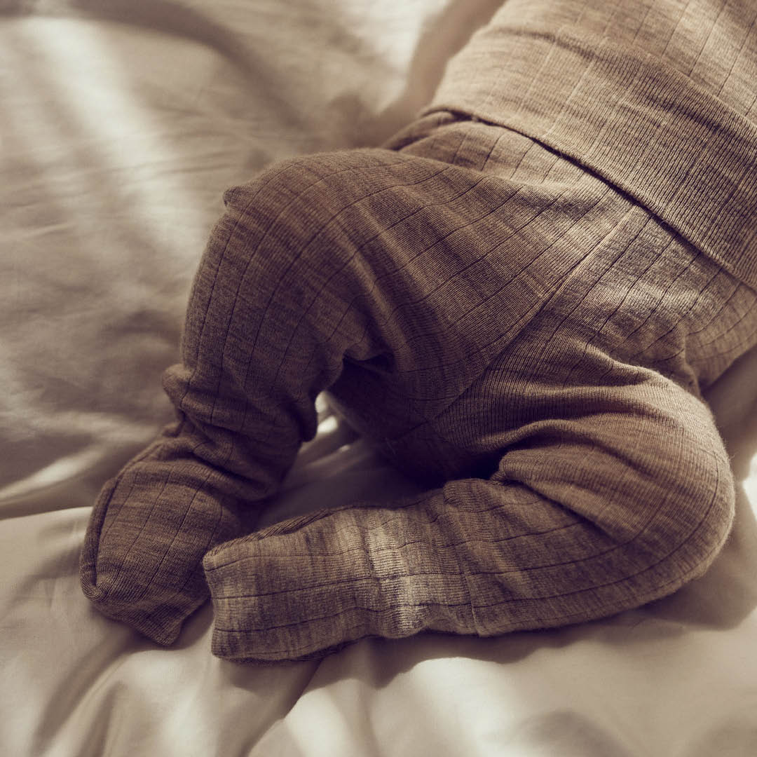 Hergestellt aus hochwertigem und weichem Merinowoll-Rippstrick bietet diese Hose eine natürliche Wärme- und Feuchtigkeitsregulierung. Die Wolle transportiert Schweiß von der Haut weg und hält das Baby trocken und warm.