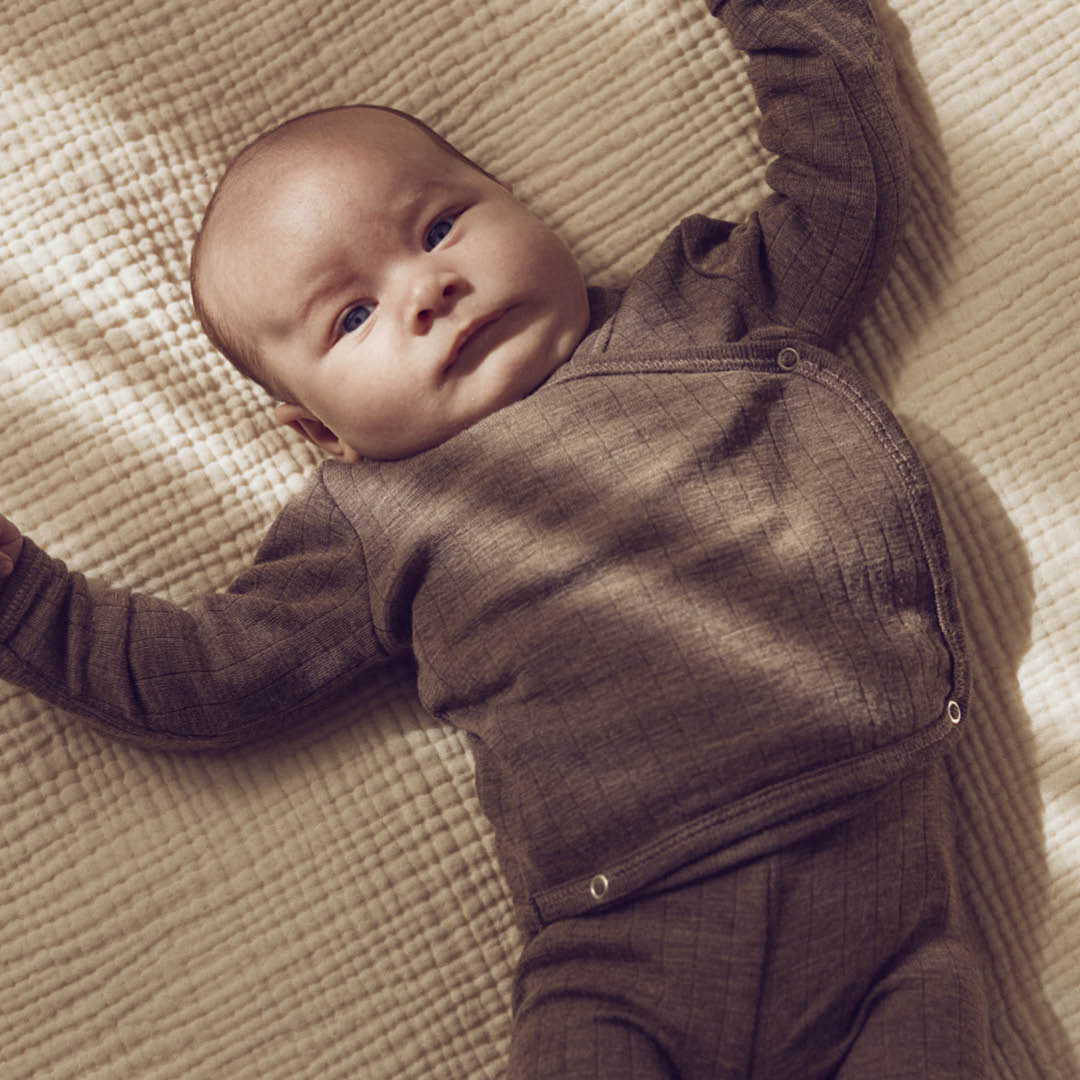 Die natürlichen Eigenschaften der Merinowolle sorgen dafür, dass die Körpertemperatur reguliert wird und dein Baby trocken und warm bleibt, da die Wolle Schweiß von der Haut ableitet.