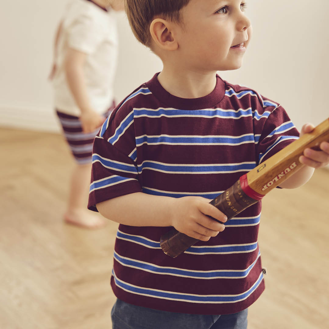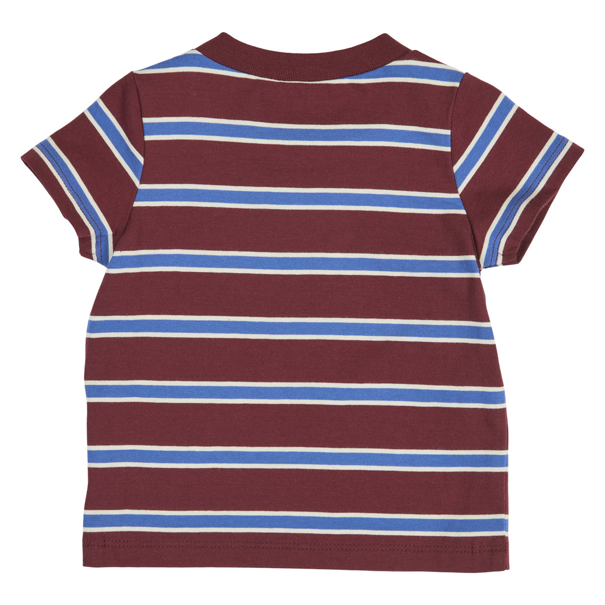 Dieses tolle T-Shirt begeistert mit seinen stylischen, breiten Querstreifen in den Farben Blau, Dunkelrot und Creme. Damit ist ein eleganter Look garantiert, der auffällt! Das moderne und zeitlose Design ist perfekt für kleine Modefans, die gerne stilvoll unterwegs sind.