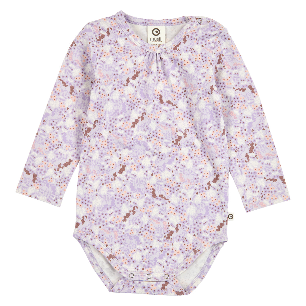 Dieser hübsche Langarmbody verzaubert mit einem niedlichen All-over-Print aus bunten Blumen und lieblichen Pferden, die direkt von der weiten Prärie zu stammen scheinen. Das verspielte Design bringt einen Hauch Natur und Abenteuer in den Alltag und sorgt für einen charmanten Look bei jedem Anlass.