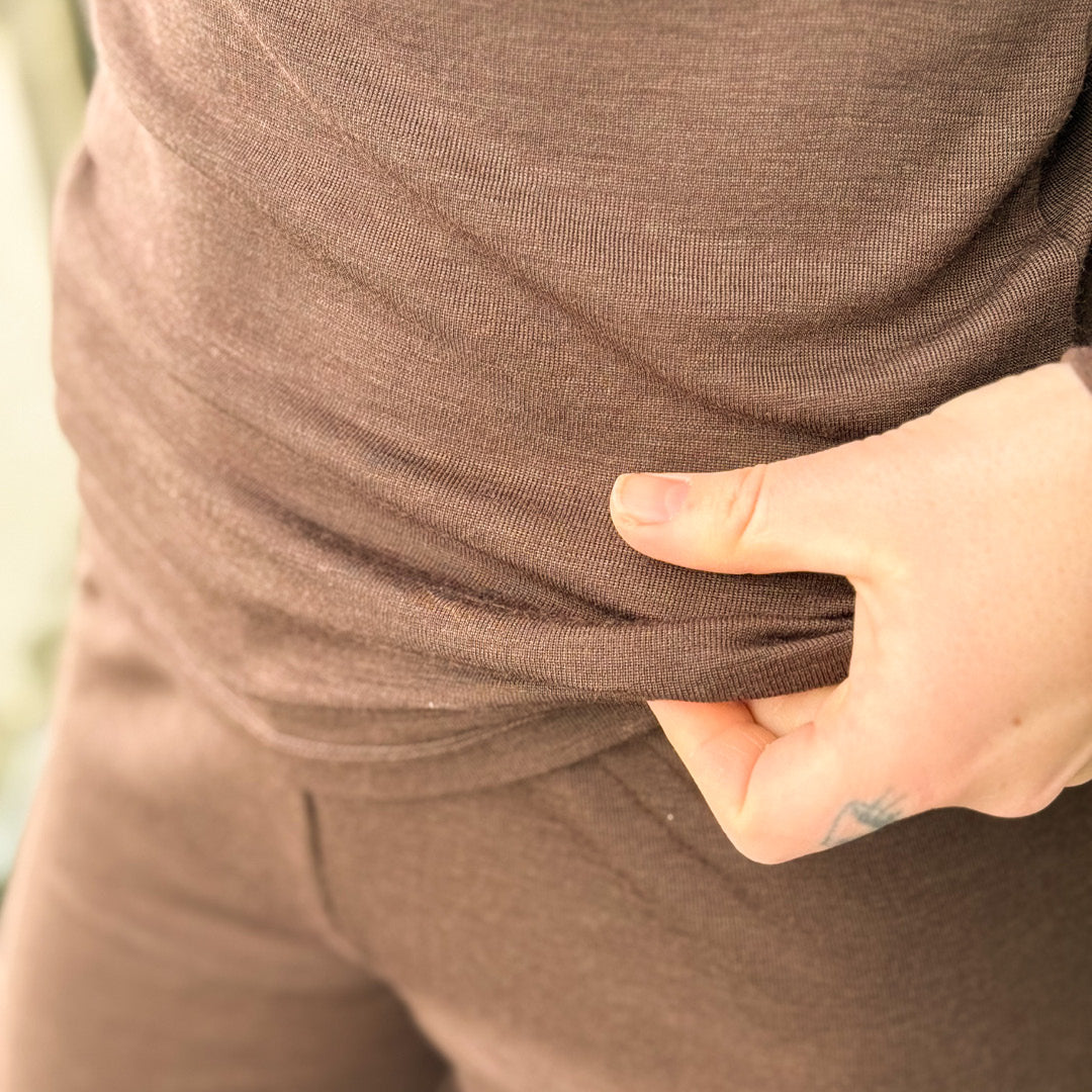 Das Langarmshirt ist aus reiner Merinowolle hergestellt. Die Qualität der Wolle ist sehr zart und kratzt nicht auf der Haut. Das Shirt hat einen Rundhalsausschnitt und lange Ärmel.