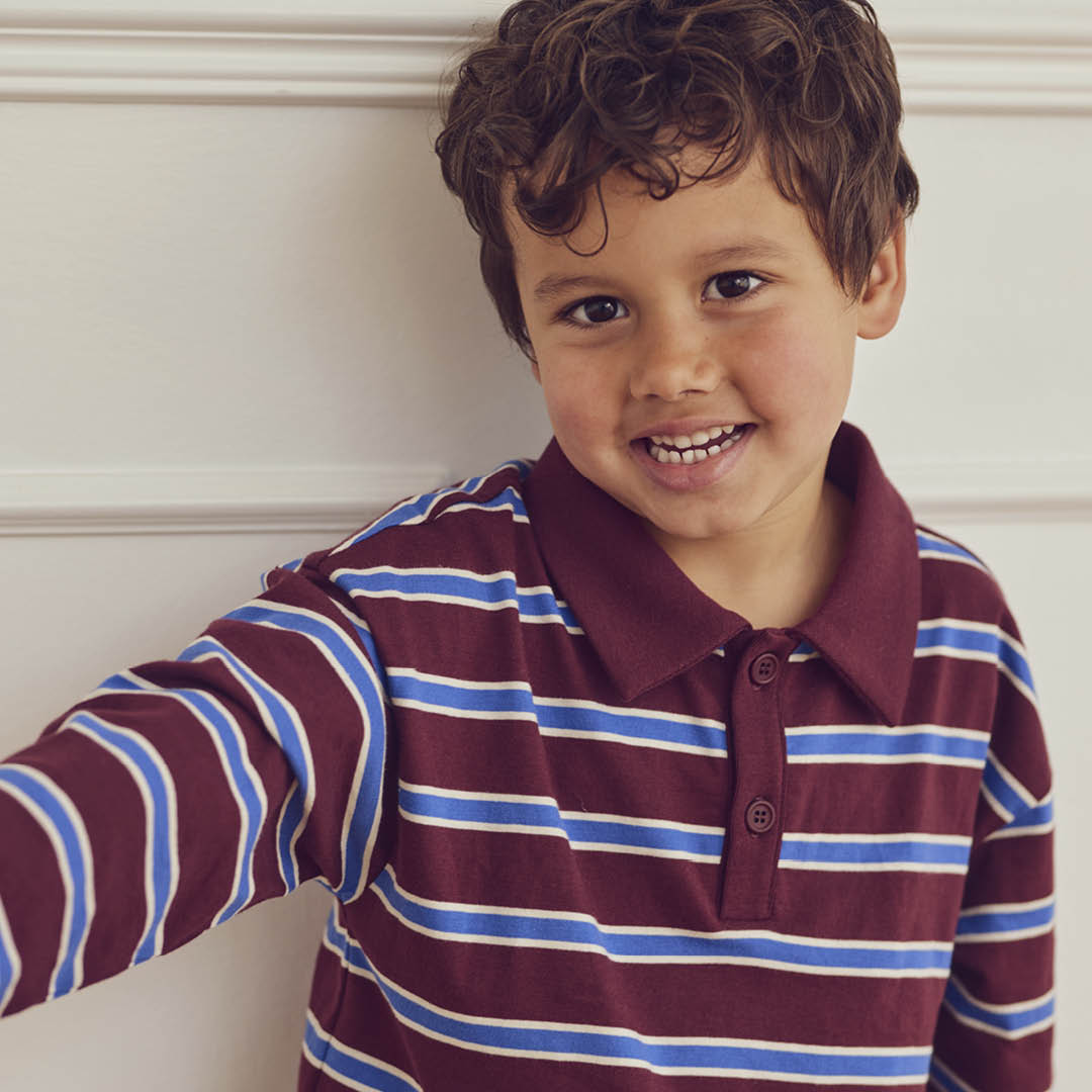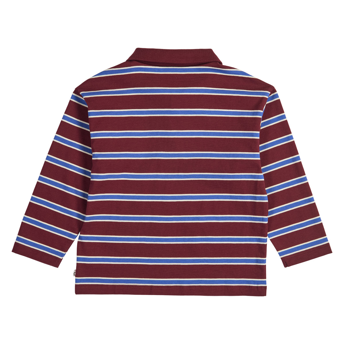 Dieses wunderschöne Polohemd mit langen Ärmeln begeistert durch seine breiten, eleganten Querstreifen in harmonischen Blau-, Dunkelrot- und Cremetönen, die dem Shirt einen zeitlosen und zugleich lebendigen Charakter verleihen. Der dekorative Kragen mit feinen Knöpfen setzt stilvolle Akzente und macht das Polo zu einem vielseitigen Begleiter – ob beim Spielen im Park oder bei festlichen Anlässen.