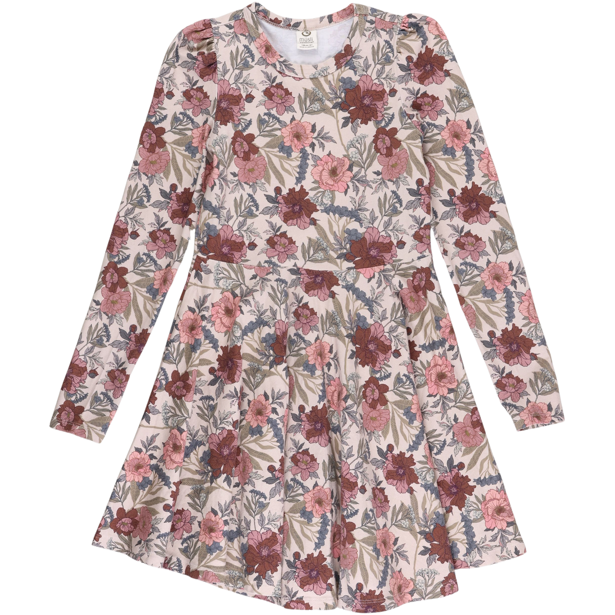 Entdecke das süße Langarmkleid mit einem wunderschönen All-Over-Print in Herbstfarben mit einem ausgestellten Rock, der deinem Kind ein bezauberndes Aussehen verleiht!