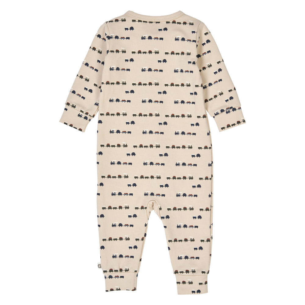 Der Strampler verfügt über einen praktischen Reißverschluss an der Vorderseite, der sich vom Ausschnitt bis zum Schritt erstreckt und das An- und Ausziehen erleichtert. Mit einem bezaubernden Print mit vielen verschiedene Zügen die wie auf Schienen über den Strampler zu fahren scheinen, ist dieser Strampler nicht nur bequem, sondern auch stilvoll.