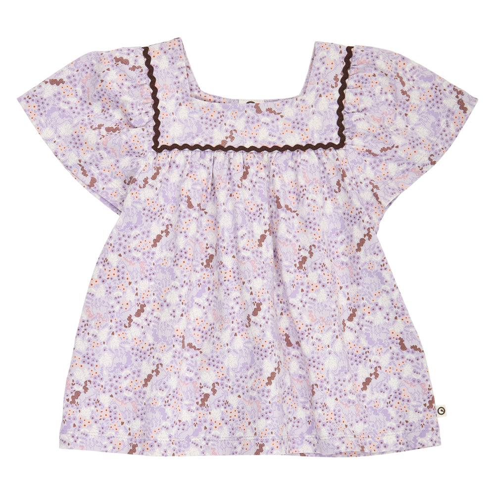 Dieses besonders niedliche, weit geschnittene Top verzaubert mit einem liebevollen All-Over-Print, der zarte Blumen und anmutige Pferde aus der weiten Prärie zeigt – ein Design, das kleine Träumer und Entdecker gleichermaßen begeistert. Die kurzen, großzügig geschnittenen Ärmel verleihen dem Oberteil eine luftige, leichte Silhouette und sorgen für viel Bewegungsfreiheit, damit sich Kinder frei und unbeschwert fühlen können.