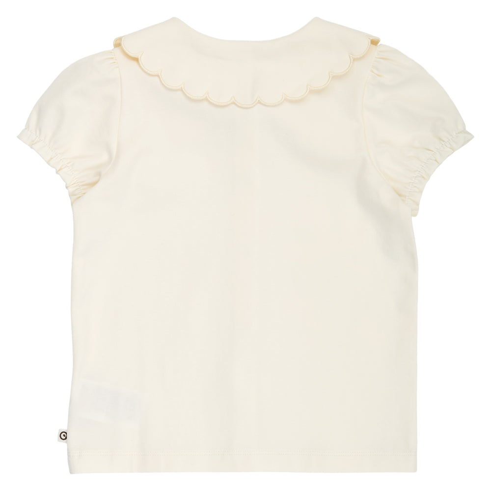 Dieses zauberhafte Shirt-Top verführt mit seinem dekorativen Kragen, der dem Oberteil eine elegante und verspielte Note verleiht. Die süßen Puffärmel zaubern einen charmanten, kindlichen Look, der kleine Herzen höherschlagen lässt. Die zarten Knöpfe, die sich vorne entlang der Mitte anreihen, setzen liebevolle Akzente und machen das Shirt zu einem echten Blickfang – ein Stück, das Kinder mit Freude tragen werden.